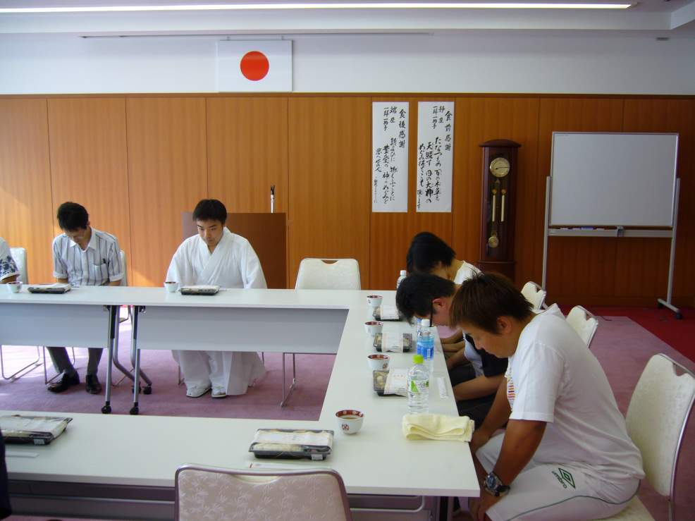 皆さん、少しお疲れですが、金田禰宜より日本古来特有の「神道」について、説明を受けました。「神道」は決して学校では習うことができないため、非常に勉強になったと思います。